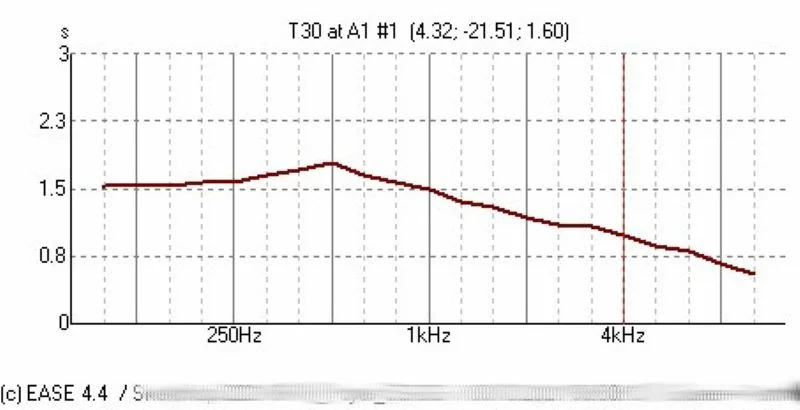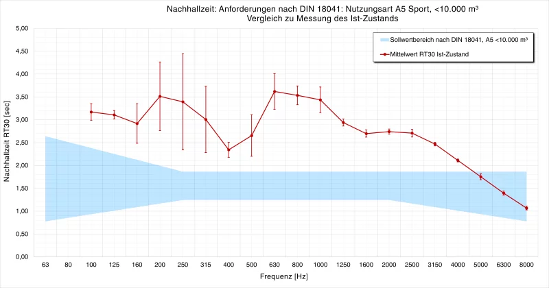 Die gezeigte Grafik (Abb: DIN 18041 Anforderungen an Raumakustik) stellt die Messung in einer mangelhaft ausgeführten Sportstätte dar. Die Nachhallzeit im Ist-Zustand (rote Kurve) ist mit etwa 3 bis 3,5 Sekunden erheblich zu lang. Zudem sind erkennbar starke Flatterechos vorhanden. Der nach DIN 18041 für diesen Raum berechnete Sollwert-Bereich (hellblau) liegt jedoch bei 1,5 Sekunden!